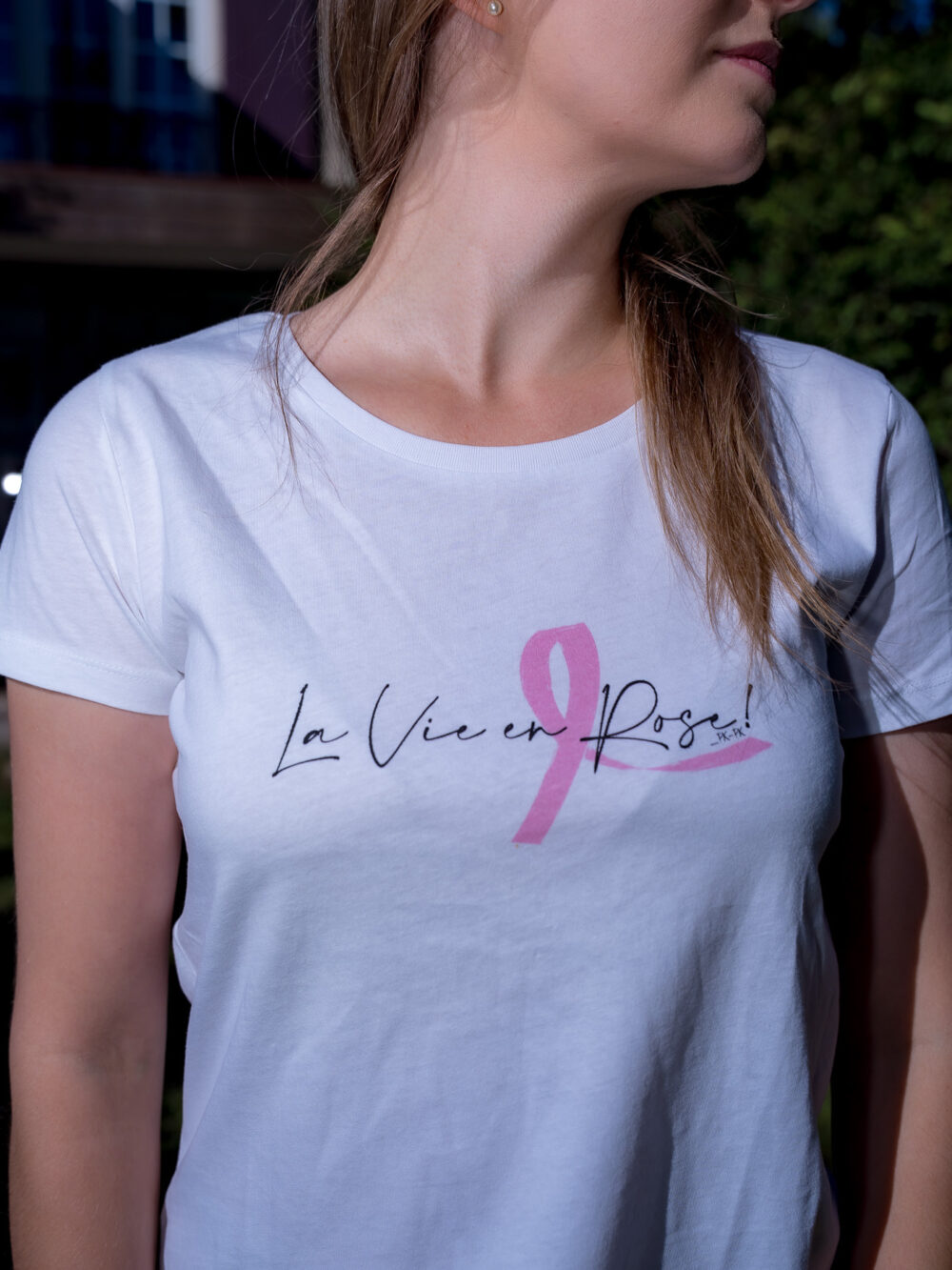 Cette collection capsule a été pensée comme un hommage vibrant à toutes les femmes touchées de près ou de loin par le cancer du sein. En partenariat avec la Ligue contre le cancer Comité du Var, chaque t-shirt devient un geste solidaire: 5 € sont reversés à la Ligue pour chaque achat.